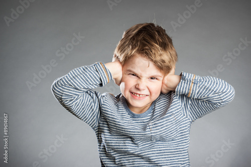 Portrait, Junge, grauer Hintergrund, nichts hören, Ohren zuhalt
