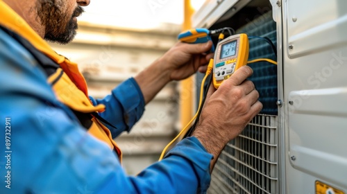 A skilled air conditioning serviceman in a blue uniform uses a digital multimeter to check the voltage on an outdoor HVAC unit