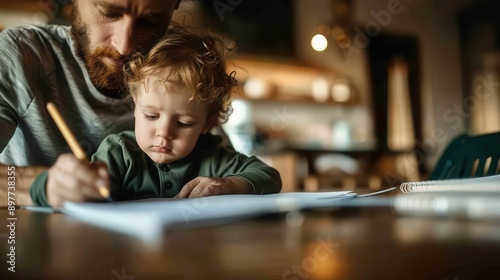 A father and his young son share a bonding moment while drawing at the dining table, showcasing a blend of concentration, creativity, and familial love in a warm home environment.