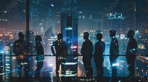 Silhouettes of Businesspeople Against a Cityscape at Night