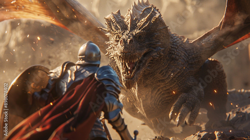 An epic battle of a knight and dragon, movie scene style