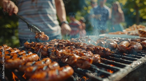 Sizzling Social Gathering: Man Grilling Sausages and Chicken Wings at a Park BBQ