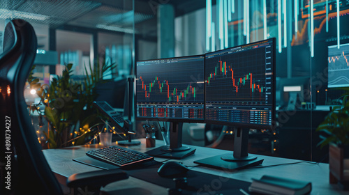A high-definition image of a stock trading chart with candlestick patterns and technical analysis tools in a modern office setting