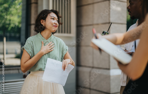 A woman converses with a colleague outside a modern office building, expressing sincerity and connection during the informal meeting.