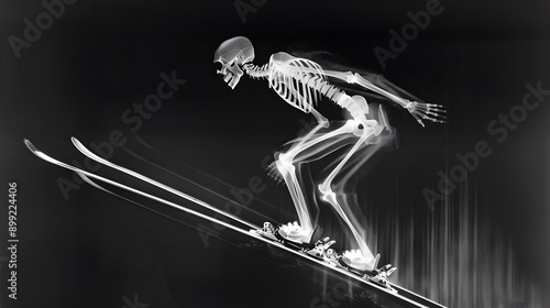 X-Ray of a Skier in Mid-Jump: An x-ray image of a skier’s skeletal form in mid-air during a jump.