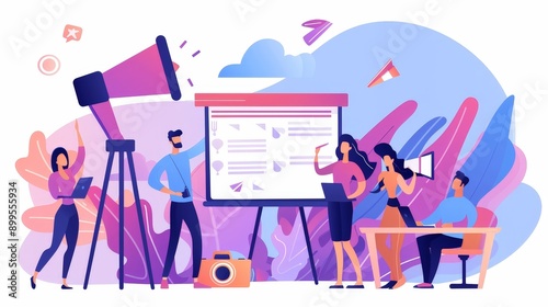 Show a marketing team working on a public relations campaign, crafting press releases and building relationships with media outlets.