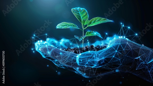 Hand holding young plant in soil on blue background. Low poly style design. Wireframe light connection structure.