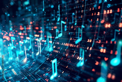 A computer screen showing a collection of musical notes in various keys and rhythms, Music notes replaced by binary code to represent digital music, AI Generated