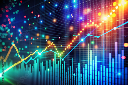 Vibrant scatter plot graph displays strong positive correlation between rising stock prices and increasing trading volume, indicating growing market confidence and investment excitement.