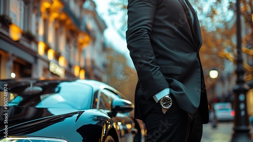 A stylishly dressed man stands confidently beside a luxury sports car in an upscale urban setting during twilight, conveying elegance and wealth.