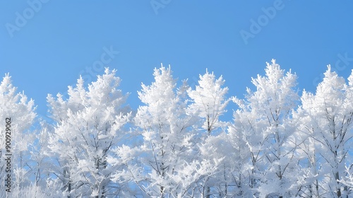 Snowy white trees from below against blue sky, winter panoramic background with copy-space.