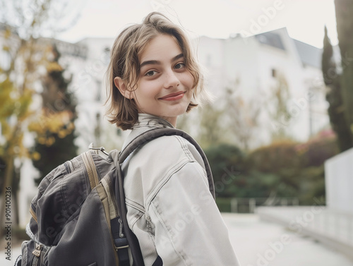 Rentrée des classes : jeune fille adolescente porte un sac à dos : lycéen ou collégien dans la cour de récréation de l'école, au lycée ou au collège