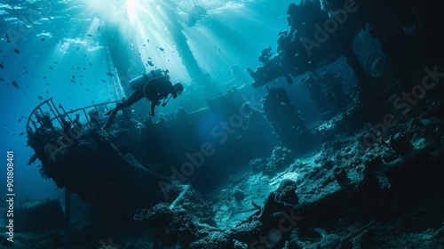 Scuba divers explore a sunken shipwreck, navigating through the eerie underwater ruins surrounded by marine life