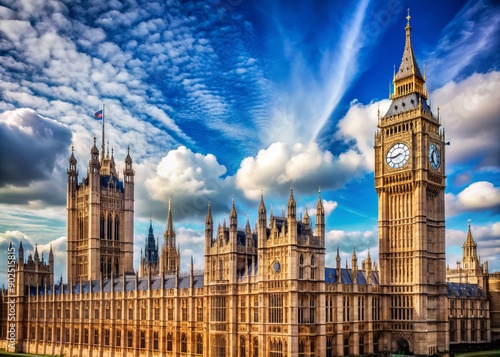 Historic clock tower and ornate Gothic architecture of the English Parliament building at Westminster, London, against a clear blue sky with fluffy white clouds.