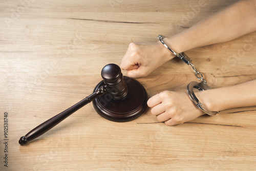 Judge Hammer for adjudication hands in handcuff. Law and justice concept. Court of law. Pronouncing sentence, striking Gavel.
