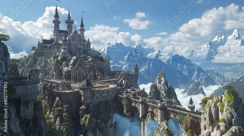 a towering mountain fortress overlooking a fantasy kingdom