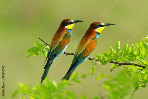 The European bee-eater (Merops apiaster), pair of wild colorful birds sitting on a branch