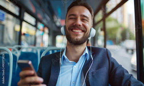 Uśmiechnięty mężczyzna w słuchawkach jedzie autobusem miejskim