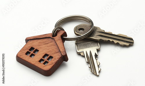 Klucze do mieszkania z breloczkiem w kształcie domu. Białe jednolite tło