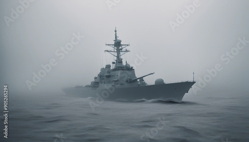 A naval destroyer navigating through a thick fog, with only the ship’s lights cutting through the gloom, while the sea swells ominously around it.