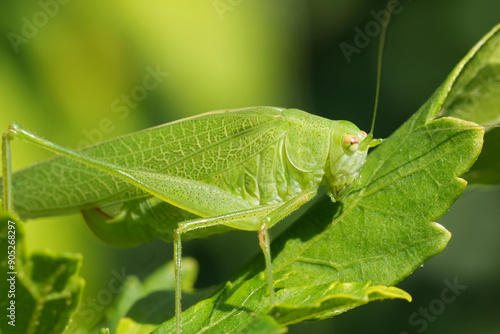 Closeup on an adult imago Mediterranean Katydid , Phaneroptera nana sitting in green vegetation