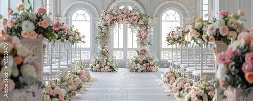 Luxurious wedding ceremony setup with sophisticated floral decor, arched walls, ideal for a timeless wedding