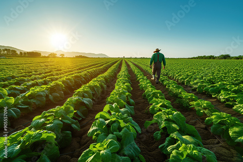 Rolnik idący po polu i sprawdzający stan upraw