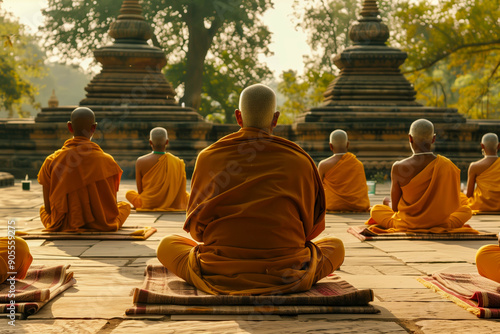 Group of sadhus meditating in the serene surroundings of the Himalayan foothills, with saffron-clad ascetics seated in deep contemplation amidst the tranquil beauty of nature