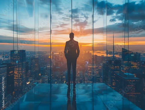 Solitary Silhouette Overlooking Cityscape Sunset from Lofty Skyscraper Office