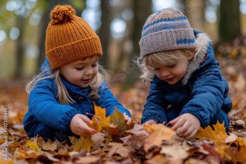 Enchanting Moments: Kids Immersed in Mindfulness, Collecting Autumn Leaves in Whimsical Forest Setting