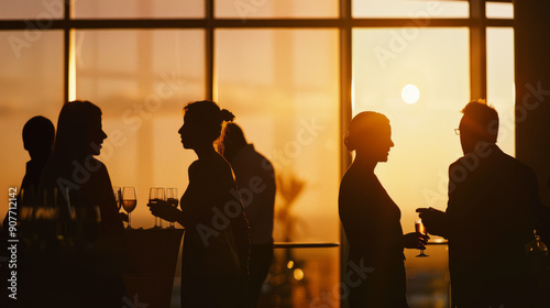 Silhouettes of people mingling and chatting over drinks in front of large windows, bathed in warm sunset light at an elegant social gathering.