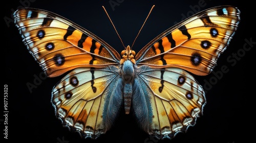 symmetrical, realistic photo of an exotic butterfly, full body, spread out taxidermy body