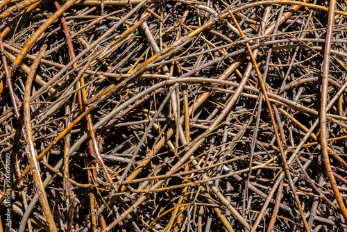 Tangled pile of dry twigs and branches various shades of brown.