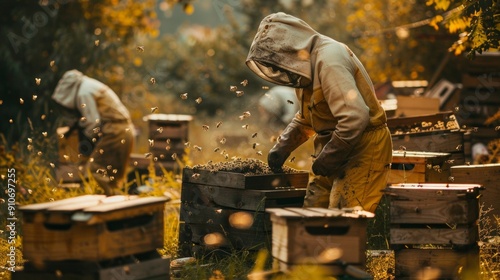 A beekeeper is working with bees in the apiary on a beautiful sunset