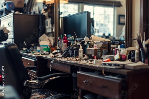 Chaos Unleashed: A Desk Overflowing With Clutter, The artful messiness of a hairdresser's workstation after a busy day, AI Generated