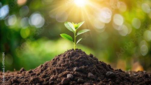 A pile of dirt with a thriving plant next to money symbolizing a sustainable and profitable environment, sustainable