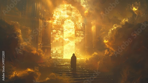 luminous staircase ascending into ethereal clouds golden light streaming through ornate gates silhouette figure contemplating spiritual journey
