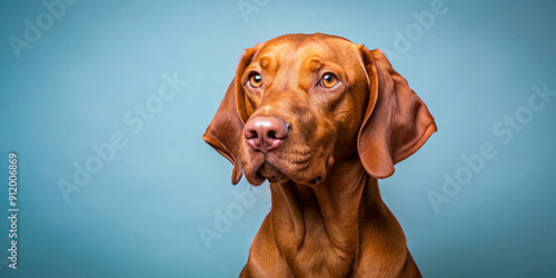 Adorable ginger Hungarian vizsla looks left in a studio setting against a light blue background, showcasing its gentle expression and beautiful brown coat details.