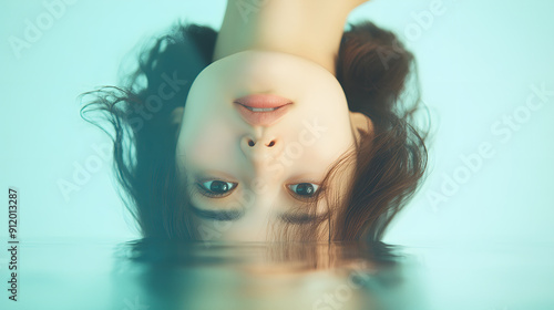 Asian woman sinking upside down underwater in a double exposure portrait with technology, digital glitch and error. Innovative inspired imagery, combining modern and futuristic art concepts.