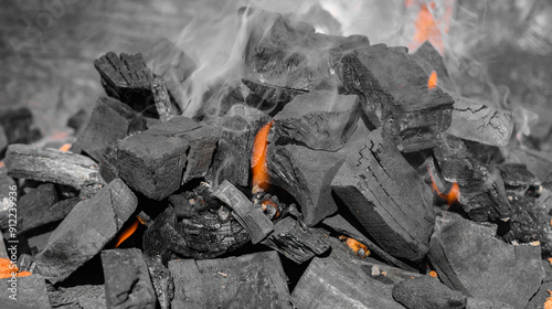 Palący się węgiel drzewny, płomienie i czarny węgiel z bliska