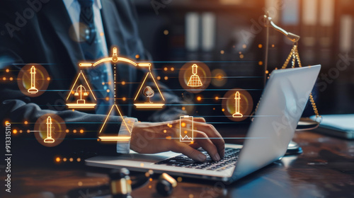 Lawyer using a laptop to work with legal services icons on a virtual screen, offering online legal advice on business legislation and justice