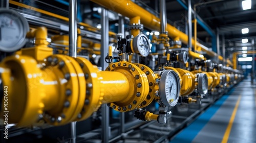 Yellow pipes and valves in gas plant. Gas plant concept with control system