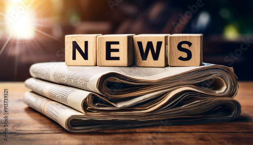 Stacked and folded newspapers, and the word NEWS in wooden block puzzle dice, on a wooden table or desk. concept for newspaper, the media, press release and global communications. Generative Ai.