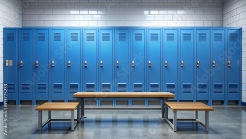 Blue metal locker cabinets with padlocks and benches in a locker room , metal, lockers, cabinets, blue, padlocks