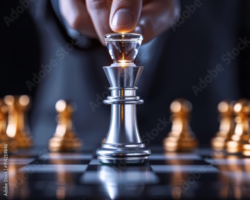 A close-up of a hand moving a silver chess piece on a board, symbolizing strategy and critical thinking in a game of chess.