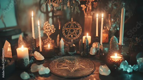 Wiccan altar with candles, crystals, and pentacle in mystical ambiance