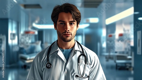 Médico profesional de la salud atendiendo paciente en sala de urgencias o consultorio, con bata y estetoscopio