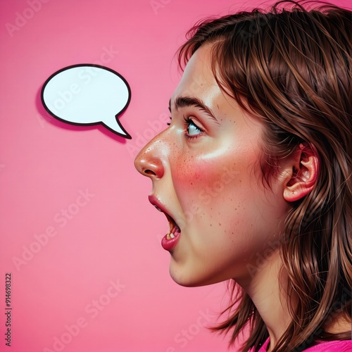 Hermosa mujer sorprendida, boquiabierta, con rostro muy expresivo, con una burbuja de diálogo en blanco. fondo rosa.