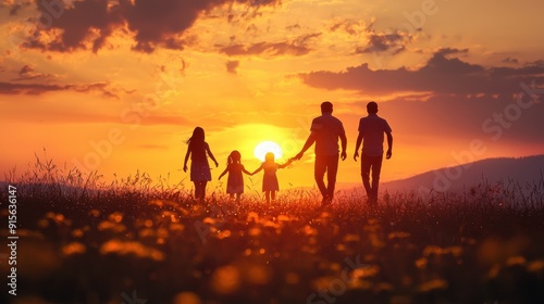 Happy family: mother, father, children son and daughter on sunset generative ai