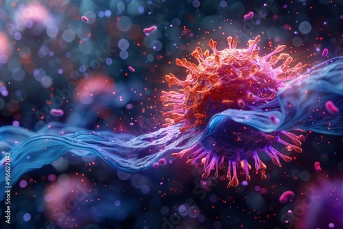 A microscopic depiction of a virus entering a human cell, showcasing its structure and the process of infection